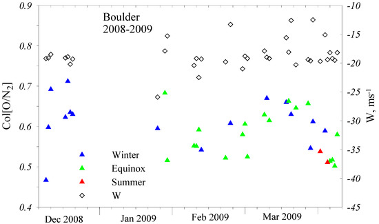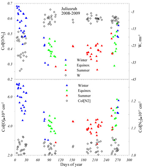 Dates with well-pronounced seasonal difference in foF2 diurnal variations observed at Juliusruh were developed with our method [18] to retrieve noontime thermospheric parameters. Among them, column [O], [N2], and the column O/N2 ratio (Figure 5) were calculated above the height with N2 column density of 1017 cm−2 [23] to compare with the GOLD [9] results. The retrieved vertical plasma drift W mainly related to the meridional Vnx neutral wind component is also given in Figure 5 (top panel). It is seen that column O/N2 ratio variations are practically totally due to atomic oxygen, while column [N2] variations are very small, within ~6–7% throughout the year.
