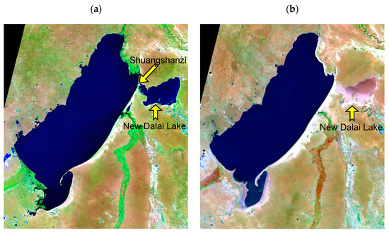 Location and status of New Dalai Lake in different periods (false color synthesis of remote-sensing images): (a) 2000, and (b) 2007.