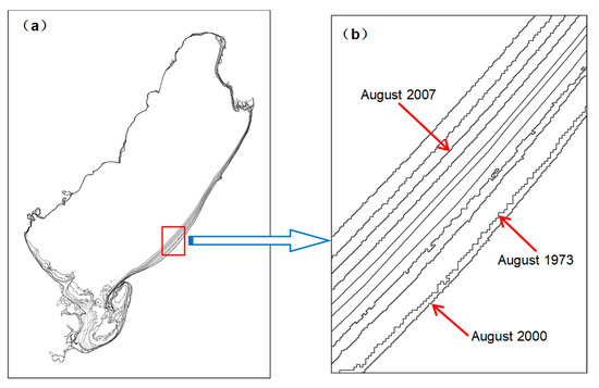 First, remote-sensing images were used to extract the lake shoreline of Hulun Lake from 1983 to 2016 and in 1973. The shoreline of Hulun Lake changed little from 1983 to 1999. The lake area shrank and the water level fell more severely from 2000 to 2009, and the lake shorelines during these ten years are superimposed in Figure 4a. As shown in Figure 4a, when the water level of Hulun Lake dropped, the lake’s shoreline did not change significantly in the images because of the cliff or steep slope of the geological-fault lakeshore on the western side of the lake. The main changes in the shoreline occurred on the southern and eastern sides of the lake, and the changes on the southern side were more disorderly and had no obvious rule. The eastern shoreline of the lake exhibited regular displacement due to the topography. The position of the box in Figure 4a is the partially enlarged area in Figure 4b. The right-most line is the position of the lake’s shoreline in August 2000, which is also the year when the lake was the largest in recent decades. The second line from the right is the position of the lake’s shoreline in August 1973. The third line from the right is the position of the lake’s shoreline in the summer from 2001 to 2009.