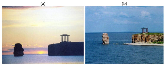 As shown in Figure 4b, the eastern shoreline of Hulun Lake receded regularly as the water level decreased. The main reason for this situation is that this area is composed of gently sloping lacustrine alluvial deposits, with a uniform slope and a large distribution range. According to the terrain characteristics and field investigations, the water-level data can be prolonged accurately. Figure 5 shows a comparison of photographs of a cultural attraction (i.e., the stone used to tie the horse for Genghis Khan) on the west bank of Hulun Lake in the summers of 2000 and 2007. It can be seen that the water level dropped significantly, and the highest water level made a mark at this site, which could be clearly identified in 2000. According to the field surveys conducted at this site in recent years, the water level in August 2007 was 3.33 m lower than the maximum water mark for 2000. According to the position of the lake’s shoreline extracted from the remote-sensing image, the distance between the horizontal position of the lake’s shoreline in the summers of 2000 and 2007 was 1901 m, which was obtained using the measuring tool in ArcGIS for the area shown in Figure 4b. In 2009, our team used surveying and mapping instruments to measure the topographic slope of this location, and the measured slope was 0.175%, which is consistent with the calculation results of the remote-sensing-image and field survey. Thus, the position of the lake’s shoreline in this region exhibited regular displacement with the change in the water level; that is, the lake’s shoreline at the position shown in Figure 4b receded by 570.9 m for every 1-m drop in the water level of Hulun Lake.