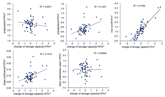 The aforementioned change in the lake’s storage capacity ΔV/Δt represents the fluctuation in the quantity of lake water. In order to further analyze the causes of the dynamic evolution of the quantity of water in Hulun Lake, a correlation analysis was conducted between the terms in Equation (5) and ΔV/Δt. The most significant correlation was the most important factor controlling the fluctuations in the quantity of water in Hulun Lake. Scatter plots illustrating the correlation analysis are shown in Figure 10.