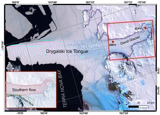 Terminal part of the David Glacier and the floating Drygalski Ice Tongue (USGS—LIMA Landsat high-resolution virtual mosaic). Red dots are the positions of the temporary GNSS stations ICF1 and DRY1. Two interpretations of the grounding line are reported in the figure: (blue) grounding line extracted from ASAID [4], (purple) grounding line described by the Project MEaSUREs Antarctic Grounding Line from Differential Satellite Radar Interferometry, Version 2. Both GNSS stations collected data simultaneously for 24 days in 2006, from 15 January 15 to 7 February. In the detail box inside the figure, the two main ice flows (southern and northern) are indicated with dashed red and green lines, respectively [6].