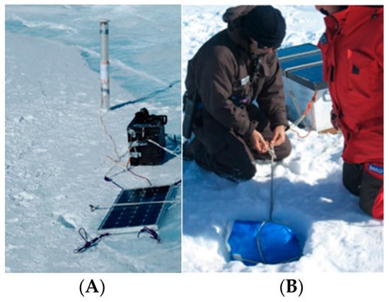(A) DRY1 semi-permanent GNSS station monumented on ice; (B) anchoring the instrument box and the solar panel to a dead body buried in the ice.