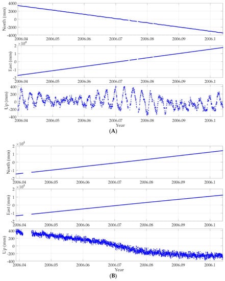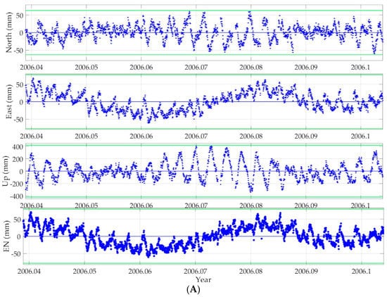 The open-source software Tsview, a MatLab program for interactive analysis of the time series based on the least squares fitting technique [26,27], was used to estimate linear trends and residual detrended coordinates of time series. The station velocities were then estimated individually for each component from the station position time series.