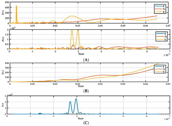 Spectral analysis of GNSS time series provides a very powerful tool for understanding signals due to the intrinsic mechanism affecting the movements of the stations [26]. This results in an intuitive means of determining the period of oscillation, but, unfortunately, the total sampling period of 24 days is not long enough to estimate the interesting frequency of 14 days due to the passage of the moon at the equator. Furthermore, the spectral analysis of NEU components was performed only on shorter periods, due to the main diurnal and small semi-diurnal components of the ocean tide, using the Lomb-Scargle periodogram [27,28,29], a statistical tool which can detect and characterize periodic signals in unevenly sampled data. This method evaluates the time series data at the measured time and reconstructs the missing values from the amplitude and phase information of the dominant frequencies, without performing any interpolation [30]. The results of the analyses are presented in Figure 4, Figure 5, Figure 6 and Figure 7 and in Table 2.