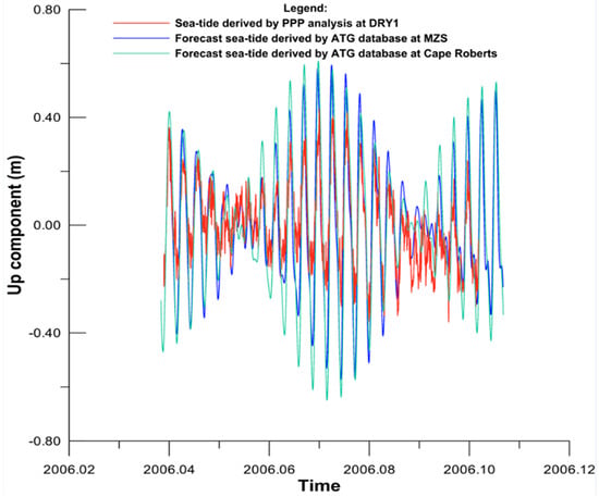 Comparison between the time series of the Up component obtained from the PPP calculation of the GNSS observations acquired at DRY1 and the predicted ocean-tide calculated from Q1, O1, P1, K1, N2, M2, S2, K2 harmonic coefficients published in the ATG database for two sites: MZS (about 100 km north of DRY1) and Cape Roberts (about 170 km south of DRY1). The diurnal declinational tides K1 and O1 are the most important tides, which occur once a day. In the Ross Sea, as well as in the coasts between 65°W to 140°E, there is a tide cycle per day; the lunar phases almost do not affect the tides. This confirms Thiel et al. [31], who first showed that the Ross Sea tide is diurnal and that the solar component predominates.