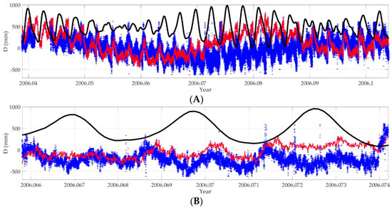 DRY1 East (red) and North (blue) components with respect to the predicted tide signal (black); (A) whole series, (B) a detail around tide daily signals.