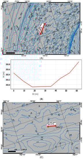 DTM extracted from REMA [40]. The red arrows of figure (A,C) represent the 2D rate of movements shown in Table 1 (ICF1, 591.964 m/yr; DRY1, 543.447 m/yr); (B,D) are REMA vertical profiles from the line of movements with azimuth 41.80°N (ICF1) and 101.17°N (DRY1).