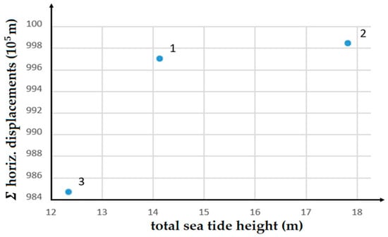 Chart between total ocean tide height (abscissa) and summation of horizontal displacements (ordinate), considering a threshold of 10 cm upon sea level. Here, displacement summation refers to the whole region of the glacier included in the SAR scenes. The numbers beside the dots refer to the SAR pairs.