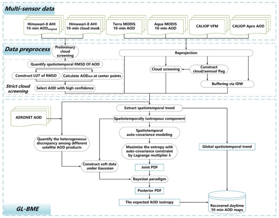 - Tang, Q.; Bo, Y.; Zhu, Y. Spatiotemporal fusion of multiple-satellite aerosol optical depth (AOD) products using Bayesian maximum entropy method. J. Geophys. Res. Atmos. 2016, 121, 4034–4048. [Google Scholar] [CrossRef]