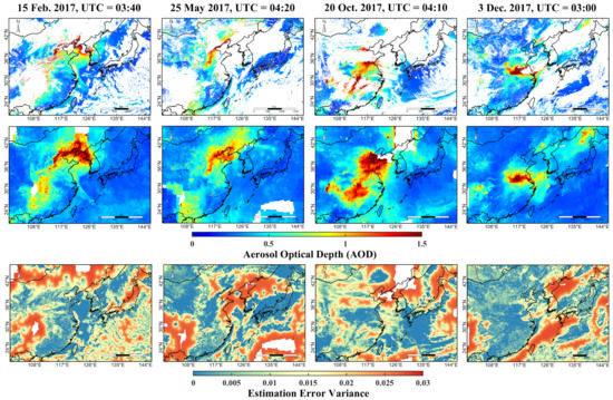 - Kikuchi, M.; Murakami, H.; Suzuki, K.; Nagao, T.M.; Higurashi, A. Improved Hourly Estimates of Aerosol Optical Thickness Using Spatiotemporal Variability Derived from Himawari-8 Geostationary Satellite. IEEE Trans. Geosci. Remote Sens. 2018, 56, 3442–3455. [Google Scholar] [CrossRef]