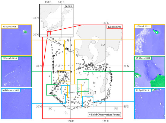 Additionally, Figure 2 presents visualizations of floating macroalgae from the field observation data from 2017 to 2022. Field observation data from 2017 to 2022 [3] had ascertained that floating macroalgae were scattered in discrete locations, including, but not limited to, the southern side of Kagoshima, the southern side of Yakushima, and the East China Sea area. A more specific description toward the occurrence of floating macroalgae was illustrated by referring to the Sentinel Hub EO Browser [4].