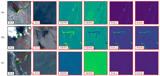 Illustration of floating macroalgae detection index on Sentinel-2 data tile (110 × 110 km2) and the enlarged panes at second to fifth columns (4 × 4 km2): (a) 27 March 2021, (b) 22 April 2019, (c) 28 March 2017. TCI, true-color image; NDVI, normalized difference vegetation index; NDWI, normalized difference water index; FAI-a, floating algae index with nearest-point interpolation; FAI-b, floating algae index with assumed zero reflectance. The details of these methods are found in the main text.