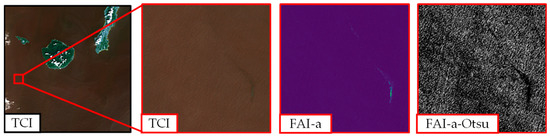 Furthermore, Figure 4 presents an illustration of the floating macroalgae detection index on a Sentinel-2 data tile (110 × 110 km2). Herein, images were sampled from three different dates: 27 March 2021, 22 April 2019, and 28 March 2017. We specified a 4 × 4 km2 sub-area that was expected to contain floating macroalgae as marked in the red rectangle. A dark visualization can be seen from the image of the true-color image (TCI).