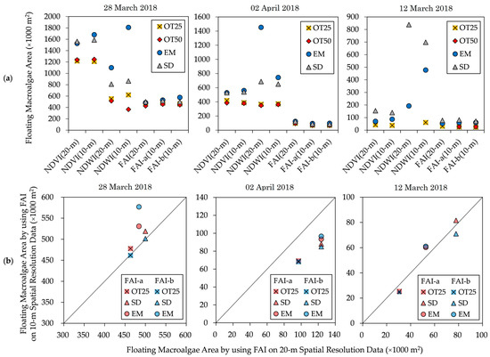 Estimated floating macroalgae area obtained by (a) various floating macroalgae detection indexes and by (b) FAI using Sentinel-2 satellite data with 10 m and 20 m spatial resolutions. NDVI, normalized difference vegetation index; NDWI, normalized difference water index; OT25, Otsu’s method based on 25% sub-area; OT50, Otsu’s method based on 50% sub-area; SD, standard deviation method; EM, exclusion method. The details of these methods are found in the main text.