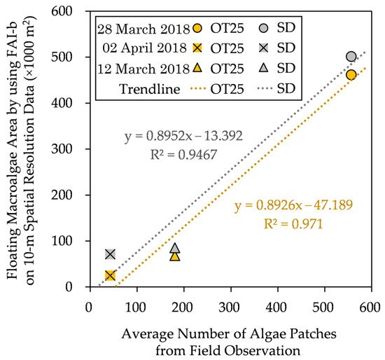 Floating macroalgae area estimated using FAI-b on 10 m spatial-resolution data vs. average number of macroalgae patches from field observation data [3]. The details of these methods are found in the main text.