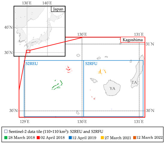 Field observation data were obtained to gain an overview of the distribution of floating macroalgae in Kagoshima, Japan [3,4]. Subsequently, visible floating macroalgae on certain days could be observed in the browser of Sentinel-2 satellite data [4]. The Sentinel-2 satellite data of the visible floating macroalgae toward the datetime of the yellowtail larva information in the Kagoshima area are shown in Table 2. As mentioned in Section 2.1, the Sentinel-2 satellite cycled every five days; thus, the captured data may not fall particularly on the same day with the datetime of field observation data [3]. In this context, six images from different dates were collected based on the visible occurrence of floating macroalgae despite the environmental factors [4,26].