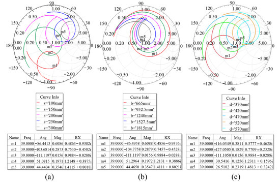The simulation results of the designed turnstile antenna with varying parameters (a) s, (b) b and (c) d.
