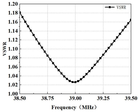 The fabricated antenna and array are shown in Figure 7a,b. To verify the radiation characteristic of the antenna, the fabricated antenna is erected in the open field. VSWR was measured using the Rohde & Schwarz ZNLE3 Vector Network Analyzer, and the simulated and measured results are presented in Figure 8. The measurements are in good agreement with the simulations. The measured VSWR in the impedance bandwidth ranges from 38.5 MHz to 39.5 MHz is less than 1.2. The slight frequency shifts are attributed to fabrication and welding imperfections.