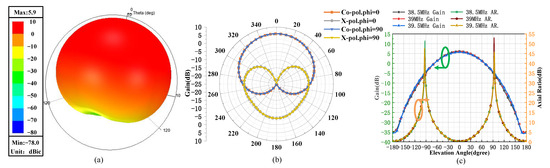 The simulated far-field results of the designed turnstile antenna. (a) 3D radiation plot of the proposed antenna; (b) Results of coplanar polarization and cross polarization in two orthogonal planes; (c) Results of gain and axil ratio.