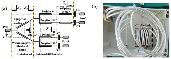 The prototype of the improved feeding network. (a) the circuit principal diagram of balun and (b) photo of feeding network.