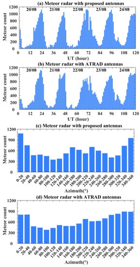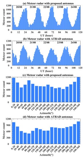 Comparison of count and azimuth distribution of meteors. Meteor radar with antennas of proposed (a,c) and ATRAD (b,d).
