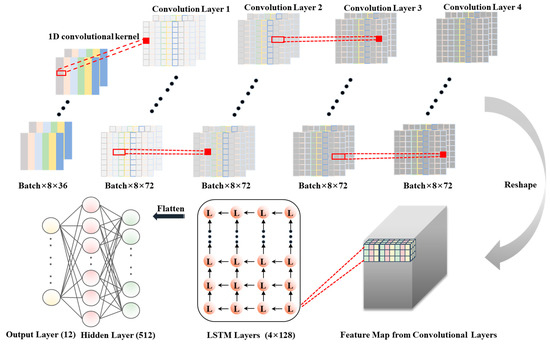 The LSTM network layers contain four layers, and the input data are derived from the features obtained from the CNN layers. The first LSTM layer contains 128 cells, and the output dimension of all the other three LSTM layers is also 128. The effective features are extracted by four LSTM layers.