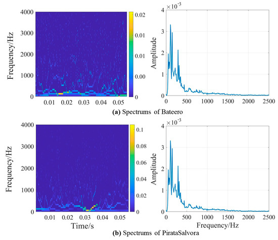 For sampled ship radiated noise, MEEMD will decompose these signals into a series of IMFs, including specific components. Once the sampled ship-radiated noise is decomposed, a sequence of IMFs can be obtained. However, direct observation of these IMF waves in the time domain still yields ambiguous results. Consequently, the first 6 IMFs that contain the main information, and the amplitude–time–frequency characteristic information is extracted by calculating the Hilbert–Huang spectrum and Hilbert marginal spectrum.