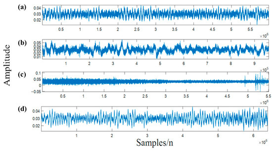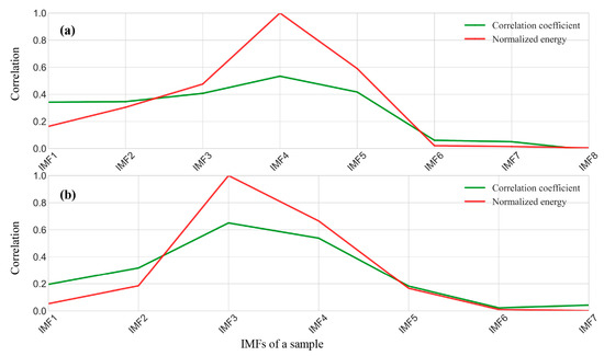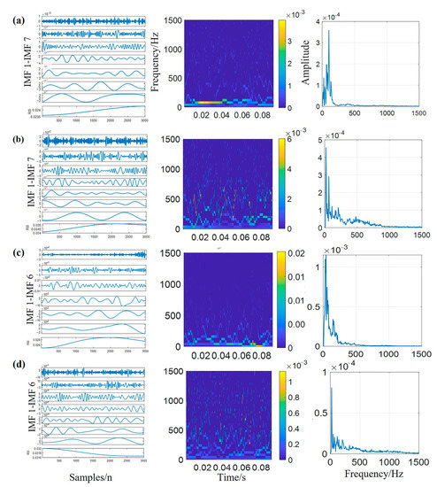 In this work, we utilize the improved Hilbert–Huang transform algorithm to achieve better feature extraction. At first, the Hilbert transform is carried out based on the decomposed signal. It is applied to calculate the instantaneous frequency of each order IMF, in order to gain the amplitude–time–frequency representation of the signal, namely the Hilbert spectrum. The Hilbert spectrum represents the distribution of instantaneous amplitudes in the frequency–time plane, with good time–frequency aggregation. Additionally, the Hilbert marginal spectrum is gained by calculating the integral of the Hilbert spectrum over the whole period, which demonstrates the distribution of the same frequency amplitude or energy superposition value in the frequency domain during the entire time–frequency range. The Hilbert spectrum and Hilbert marginal spectrum are expressed in Equations (3) and (4).