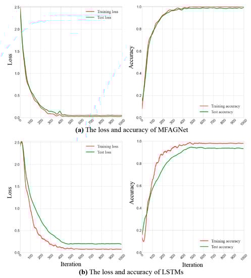 Figure 4 shows the proposed neural network structure that contains various types of modules, such as multiple convolutional neural layers, recurrent layers, and fully connected layers. The key concept of MFAGNet is to better use feature matrices that have both spatial and temporal coupling characteristics as the basis for the samples. Applying these strategies to construct network models will considerably enhance the training efficiency of the neural network model and the accuracy of the recognition performance.