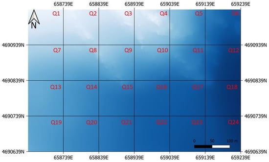 This study area was chosen because it is characterized by a high level of variability of the seabed. The entire dataset was subdivided into 24 squares (100 m × 100 m) (Figure 3), each with 10,000 depth points. The decision to divide the entire dataset into 100 m × 100 m square sectors was made to ensure distinct seafloor topographies to study the effect of morphological factors on interpolation accuracy in constructing grid DBMs. In particular, of these 10,000 points per hectare, only 95% were used to extract various subsets as seeds to generate our seabed models with the different interpolation methods. The remaining 5% were set aside and used as checkpoints for subsequent validation. This means that up to 500 checkpoints were used to assess the DBM vertical accuracy of each sector, which is enough to obtain very high reliability in the estimation of systematic and random errors [].