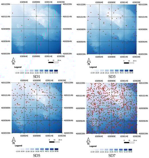 Figure 4 shows an example of some sampling densities extracted from the initial dataset of sector Q4 (sampling densities SD1, SD3, SD5 and SD7). They represent one of the four spatial distributions (repetitions) of points extracted for each sample density and sector. Note that the process of extracting the eight sampling densities was repeated four times by randomly varying the position of the sample points.