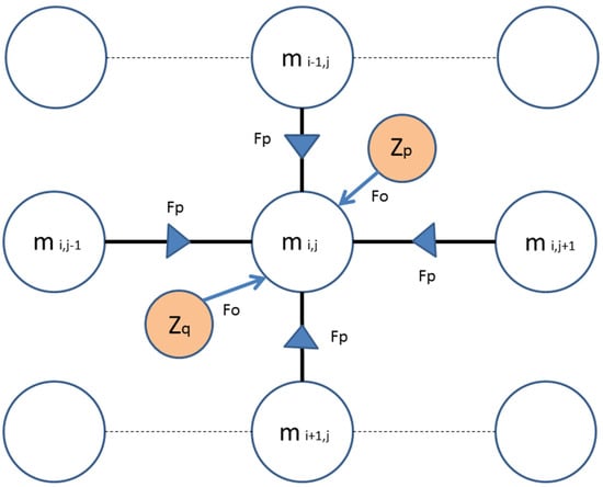 A Markov random field (MRF), also called the undirected graphical model, is a set of random variables (seabed depth in this case) having a Markov property described by an undirected graph []. Each edge-linking node in the graph represents dependency between the two nodes involved. In the case of DEM interpolation, and supposing a 4-neigborhood dependency graph for DEM grid points, two types of nodes are usually assumed: (i) estimated elevation at grid points (m) and (ii) observed elevations (z) (see Figure 6). Both affect the central cell estimate depending on prior factors (Fp) and observation factors (Fo), respectively [].