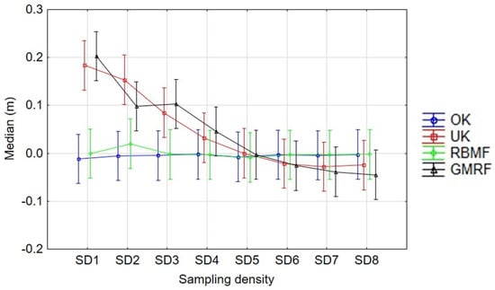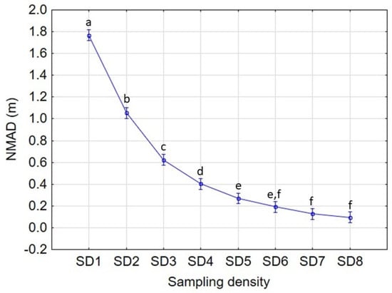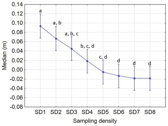 Trend graph of the median of the residuals (Zinterpolated − Zcheckpoint) with respect to the factor Sampling Density. For each SD all morphologies and interpolation methods are included. Vertical bars denote 95% confidence intervals. Different letters between sampling densities indicate significant differences according to Tukey’s test (p < 0.05).