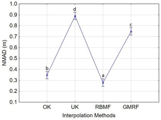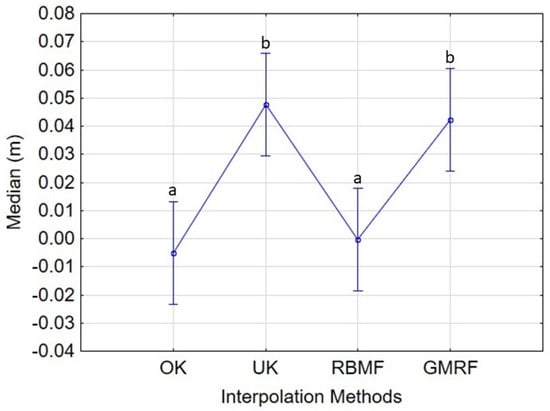 Trend graph of the median of the residuals (Zinterpolated − Zcheckpoint) with respect to the factor Interpolation Method. Vertical bars denote 95% confidence intervals. Different letters between interpolation methods indicate significant differences according to Tukey’s test (p < 0.05).