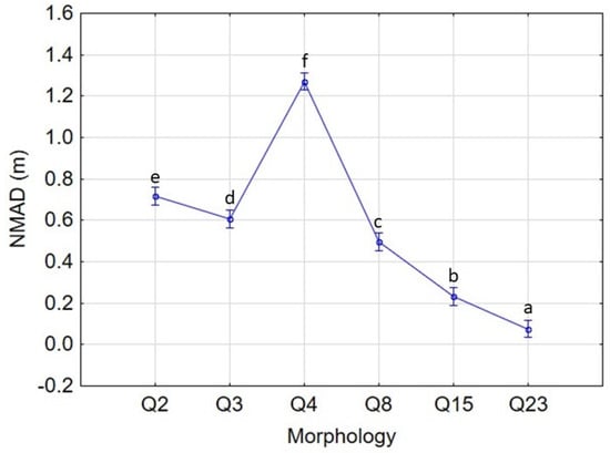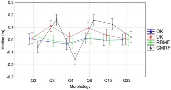 In order not to overextend the presentation of the results obtained, only the systematic errors obtained using a robust bias estimator such as the median were analyzed. Table 3 shows that all the factors that influenced the vertical bias given by the median statistical parameter (p-value < 0.05). In particular, from analyzing the F-value, it is possible to state that morphology (M) is the factor with the highest influence (F-value = 15.731). Next, we have the significant interaction between sampling density (SD) and morphology (F-factor = 11.485), and the high impact of the influence of sampling density (F-factor = 10.736). It should be noted that the interpolation method (IM), although statistically significant, was the factor that contributed the least (F-value = 8.886) towards explaining the variability of the systematic error (i.e., vertical bias).