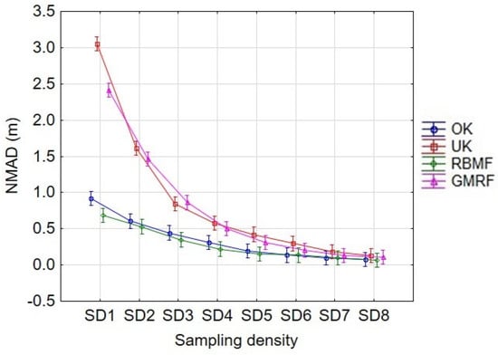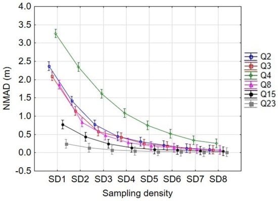 Figure 8 depicts the general trend of the vertical bias (median of the residuals) with respect to the factor SD. From the analysis of this figure, it is possible to conclude that the higher the density of the points surveyed to generate the seabed 3D models, the lower the vertical bias observed. In particular, there was first a decrease of positive bias (seabed depth overestimation) for the first four sampling densities, and a settlement for the last three, where a depth underestimation (slightly negative bias of about 2 cm) was found. Anyway, only the bias obtained for SD1, SD2 and SD3 (lowest sampling densities) were significantly different from zero (no bias), showing a low average positive bias that, in any case, was below 10 cm. This is likely due to the fact that UK needs high sampling densities to obtain more accurate results []. Note that UK is prone to overestimating the actual seabed depth, since it assumes that the mean depends on spatial location []. As far as the influence of the sampling density and the distribution of points is concerned, studies such as [,,] confirm the dependence of the model’s accuracy on both factors, thus stating the results obtained.