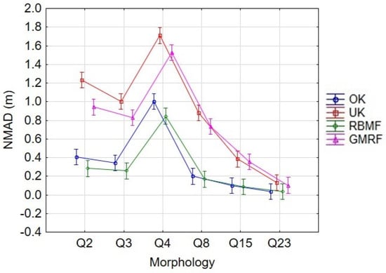 The general relationship between the interpolation method applied and the computed vertical systematic error is shown in Figure 9. It can be deduced that OK and RBMF were the interpolation methods that least influenced the bias of the seabed 3D model, both showing their potential as unbiased interpolators.