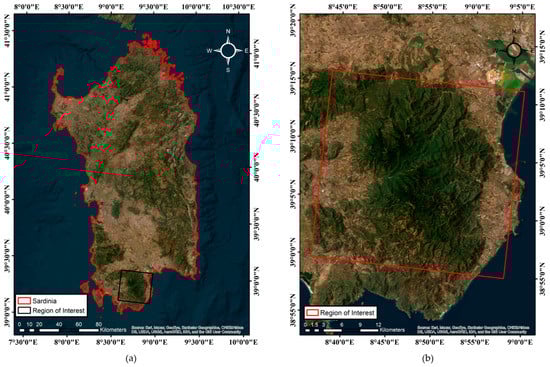 (a) Sardinia Island. (b) The region of interest is a forested area of 900 square km.