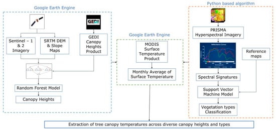 The ability to seamlessly retrieve the data in the Google Earth Engine (GEE) is unmatched, and various packages are available to further enhance its ability for modelling. In our study, canopy height estimation and tree canopy temperature mapping were performed on the GEE cloud computing platform, whereas LULC mapping, with a focus on vegetation classification, was performed with the open access software Python 3.10. A detailed description of the procedure to extract tree canopy temperatures for different canopy heights and tree types is provided in the following subsections.