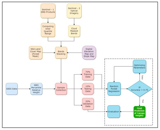 We selected random forest regression models from Google Earth Engine to predict the canopy heights over a specific region of Sardinia Island. Independent variables of the training dataset include Sentinel-1 GRD product’s VV and VH polarization bands, Sentinel-2 sensor’s B2 (492 nm) to B8 (892 nm) and B11 (1614 nm) and B12 (2202 nm) bands, and SRTM product’s (elevation and slope) maps over a 3-month period (August 2021 to October 2021). The dependent variable in the training dataset is canopy height measurements from the GEDI’s RH98 product. An interquartile range (IQR) was computed for the Sentinel-1 GRD images, considering that is where most of the values are present. Sentinel-2 optical bands were collected and a mask was used to remove the cloud cover. The European Space Agency’s (ESA) land cover map was used as a reference to collect the entire forest cover over the region. All these bands were then made into a stack for sample collection. In total, a dataset of 15,000 samples was made that was further divided into training (70%), testing (10%), and validation (20%) datasets. The model parameters (variablesPerSplit, minLeafPopulation, bagFraction, maxNodes, and seed) were taken as default values on GEE, and a range of the number of trees (from 10 to 100) (numberOfTrees) was selected to find the optimum result. The variables for the model were chosen randomly, and the final canopy heights were then predicted by calculating the average of the prediction of all the trees. Variable importance has also been calculated to figure out the most important variable that would be helpful in predicting the results. The accuracy of the regression model was estimated by calculating the RMSE and coefficient of determination (R2) values. The optimization parameters were changed until the highest accuracy of the model was obtained. Figure 3 shows the flow of canopy heights estimation algorithm.