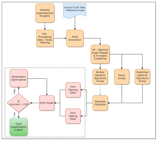Classifying land-use and land-cover types has benefited from the use of hyperspectral imagery. We considered the PRISMA Level 2C product, which is atmospherically corrected and has less than 5% cloud coverage. The PRISMAread tool, developed by the National Research Council of Italy on R software, was used for georeferencing. This tool imports the he5 format files with latitude and longitude information and converts them into GeoTiff or ENVI format files. We used the land cover map included in the PRISMA L1 product to initially differentiate between vegetated and nonvegetated pixels. One of the important preprocessing steps involved in hyperspectral data processing is removing noisy bands, which we performed in MATLAB, excluding bands that have 20% noise. After completing these preprocessing steps, we extracted spectral signatures to train the classification machine learning model using three maps, viz., a grassland map, a nature system map, and a Corine land cover map as ground truth. These maps were collected from the Sardinia Geoportal and the Copernicus Land Monitoring Services Portal. A flowchart of the classification process is shown in Figure 4.