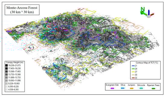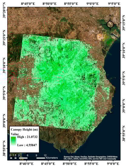 Furthermore, we continued the validation by comparing our results with the LULC map and observed that canopy heights that are less than 4.5 m were not predicted, since the minimum canopy height of GEDI’s RH98 product for our region of interest is 4.5 m. By correlating the canopy height map with the classification map, we observed that only five classes, viz., evergreen oak, olive, junipers, silicicole, and riparian trees, were predicted for canopy heights. The canopy heights of these five classes were in the range of 4.5 m to 21 m, as shown in Figure 6. These images were exported as GeoTiff files for further analysis with canopy temperature map in ArcMap, as shown in Figure 8.