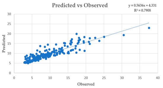 For canopy height estimation, a random forest model was used, which has been run on Google Earth Engine (GEE). We trained this model with various variables (as mentioned in Section 3) to predict the canopy heights. Performance of this model was optimized by varying the number-of-trees parameter. This model successfully predicted the heights with an RMSE of 2.9176 m and an R2 value of 0.791, which were obtained upon testing with the testing dataset of 1500 samples. The canopy height map is shown in Figure 6 and the model performance statistics can be seen in Figure 7, which shows the predicted vs. observed values for the canopy heights. Figure 7 also shows the final regression equation used for the model as an inset.