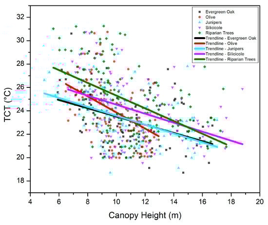 Scatter plot of tree canopy temperature (TCT) vs. canopy height for the five prevailing vegetation types (evergreen oak trees, olive trees, junipers, silicicole, and riparian trees) in the study area.
