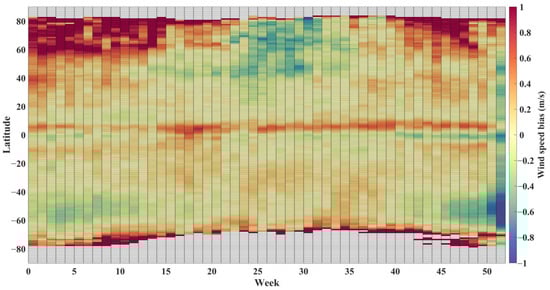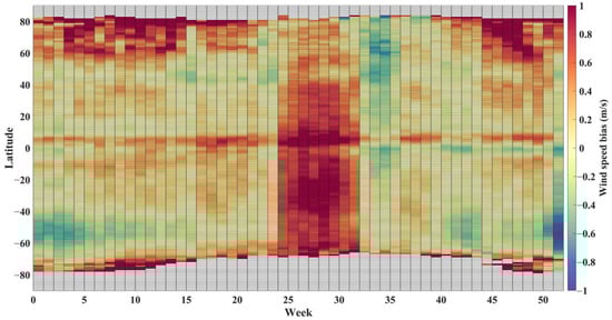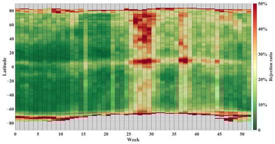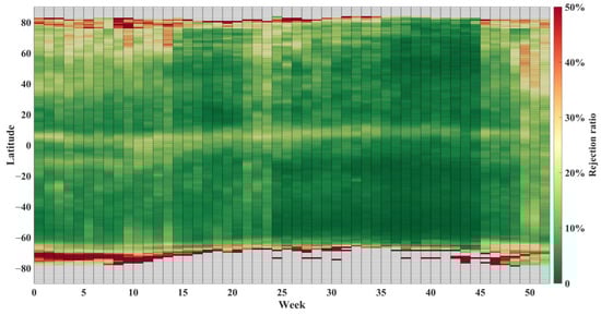 As stated before, the stability of scatterometer winds can be assessed through the temporal evolution of wind speed bias, the mean MLE value, as well as the QC rejection ratio. Therefore, the characteristics of Figure 1, Figure 8, and Figure 9 were re-evaluated, and the results are shown in Figure 11, Figure 12 and Figure 13, respectively. Although a large speed bias persists in high latitudes of the Northern Hemisphere (>60°N), these plots clearly demonstrate that the reprocessed data are generally of better temporal consistency than those of the NRT product. The persistent large speed bias (~1 m/s) in Figure 11 is probably due to the geophysical factors not accounted for by the wind GMF (e.g., sea ice, sea surface temperature (SST)), rather than the calibration procedure. Specifically, the positive bias during weeks 1–15 and 41–50 is likely caused by the sea-ice contamination not detected using the QC scheme, and the negative bias during weeks 25–32 is likely caused by the SST effects not accounted for by wind GMF [23]. The evaluation of sea-ice contamination and SST effects is beyond the scope of this paper.