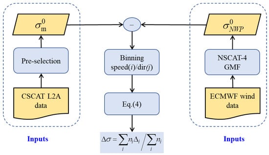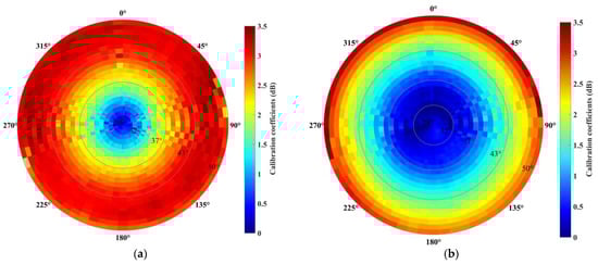 Due to the lack of knowledge of the “true” instrument parameters, in this study, we only calibrated the -factor-induced σ0 bias. A widely used NWP ocean calibration (NOC) technique, which is estimated to be with a precision of ~0.1 dB [18], was adopted to assess the calibration coefficients for CSCAT. First, the difference between the CSCAT σ0s and the simulated σ0s from the collocated ECMWF winds, together with the wind geophysical model function (GMF), was calculated [19]. Discrepancies between the above two sets of σ0s are mainly caused by the systematic errors in the knowledge of GMF and instrument parameters (e.g., antenna gain, system’s gains and losses, etc.), and the random errors in NWP winds and the measured σ0s. Second, the systematic errors, which are regarded as the calibration coefficients, were derived by averaging the difference between the measured and the simulated σ0s for given antenna incidence and/or azimuth angles [19]. The average processing eliminates the random errors in the discrepancies between the measured and the simulated σ0s.