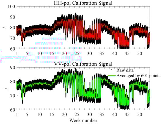 In the operational L2 processing, only the X-factor-induced σ0 bias (see Equation (1)) was considered using the NOC. The ocean calibration coefficients were derived using one month of CSCAT observations (i.e., February 2021 for the NRT product version 3.3), and then were fixed in the L2 processor for wind inversion. Such implementation may lead to poor-quality wind retrieval (see Figure 1, weeks 25–33) in case the radar faced unexpected signal fluctuations. On the other hand, one may estimate the NOC coefficients periodically using a fixed-length running window, in order to reveal the potential signal distortions during CSCAT exploitation. To determine the window size for the periodical NOC, we considered the internal calibration signal, which is used to achieve accurate calibration of the transmit power and the receiver gain [18] and is illustrated in Figure 4. Normally, the internal calibration output is very stable, and the signal-to-noise ratio (SNR) of the internal calibration channel is generally larger than 40 dB [1]. However, Figure 4 shows that temporal variations with a fluctuation of up to 0.6 dB (~15%) persisted over the long term, which occurred in line with the abnormal period (weeks 25–33) in Figure 1. Ideally, it is recommended to estimate daily calibration coefficients precisely for every incidence angle, signal polarization, and antenna azimuth. Given the fact that the NOC requires a vast volume of data to reduce the estimation uncertainty, a window size of seven days (i.e., a weekly window) was used in this study.