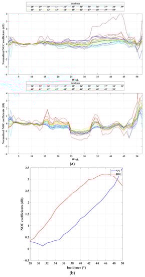 (a) Temporal variation in the normalized NOC coefficients in 2021. The upper panel is for the VV beam, and the lower one is for the HH beam; (b) the 10th week’s NOC coefficients as a function of the incidence angle for VV (blue) and HH (red) beams, respectively.