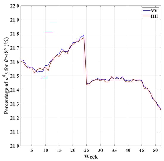 Following the above speculation, the characteristics of low SNR measurements were specifically examined. As aforementioned, the observations at high incidence angles generally correspond to low SNR (see Figure 8a in [1]); hence, the acquisitions at > 48° are mainly studied in this section. First, the number of σ0s obtained at high incidence angles was evaluated using the CSCAT NRT data. Figure 6 shows the temporal evolution of the percentage of CSCAT σ0s acquired at > 48°. Although the variation is very small (<0.5%), the curve shows fairly good consistency with Figure 4. Note that only the QC-accepted data were used for the statistical analysis, so it could be inferred that the number of QC-accepted data at high incidence angles slowly increased from weeks 5 to 25 and then dramatically decreased around week 24. Following the relationship between the QC indicator (MLE) and the quality of σ0s used in wind inversion (see Equation (5)), one may further infer that low SNR observations at high incidence angles are of great significance to the stability of CSCAT-derived winds.